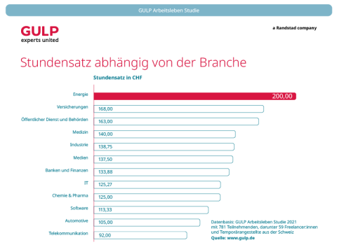Nach Branchen aufgeschlüsselt haben sich einige Verschiebungen aufgetan: Einsamer Spitzenreiter beim Verdienst ist derzeit der Energiesektor mit einem Durchschnittsstundenlohn von 200 Franken. Auch wenn der Wert aufgrund relativ weniger Antworten mit Vorsicht zu geniessen ist: Coronakrise, Klimawandel und steigende Energiepreise haben sicherlich dazu beigetragen, dass Experten und Expertinnen hier momentan gutes Geld verdienen können.
